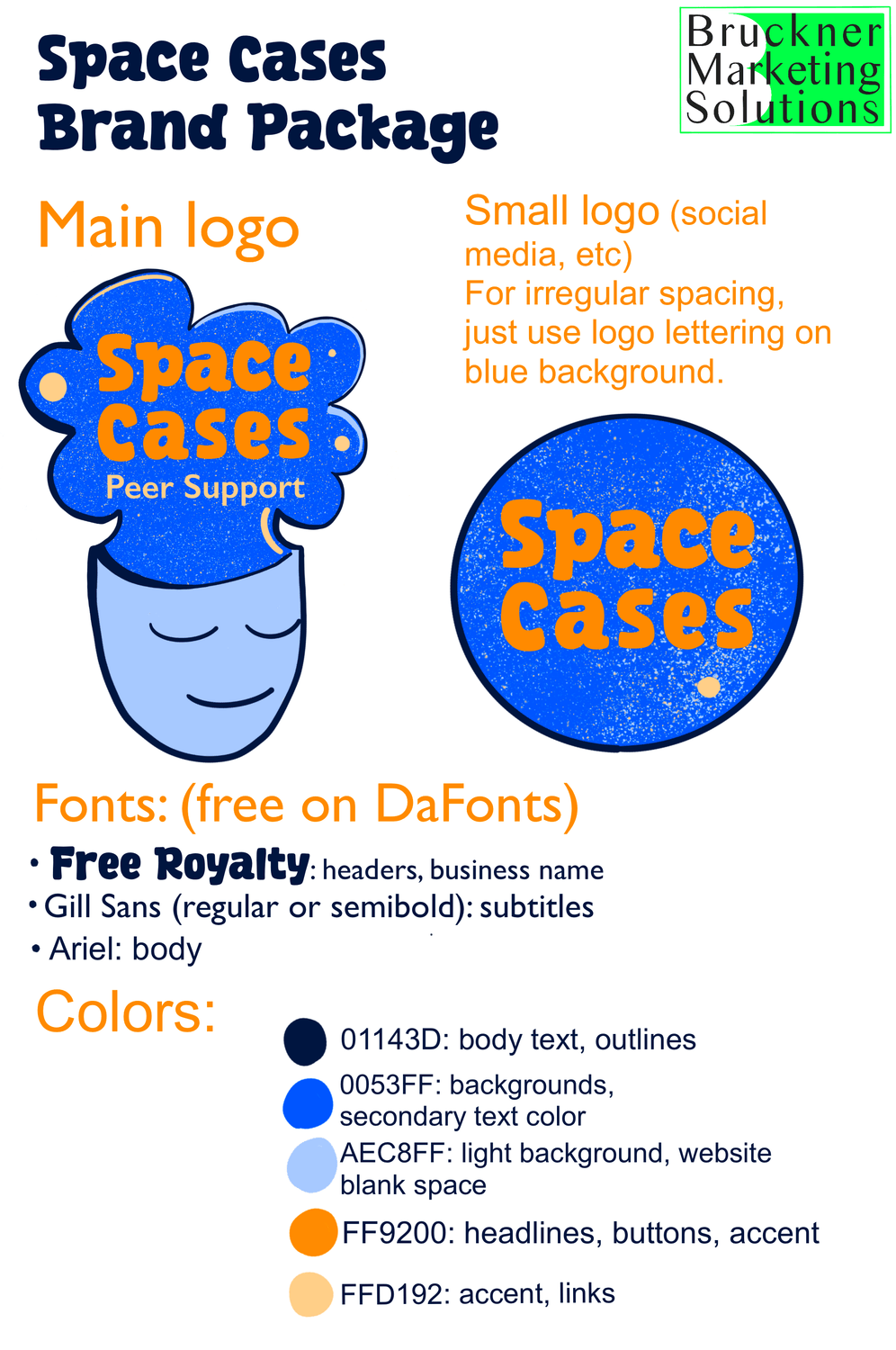 Space Cases is a company that offers peer support and workshops to youth with ADHD and other learning disabilities. The company had a very basic logo that did not fully get across core values: a safe space, a sense of whimsy, support, and positivity.